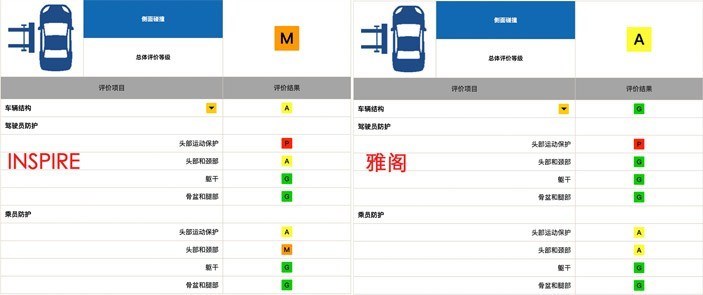 其次在侧面碰撞测试中,INSPIRE的车顶隆起情况要比雅阁情况更糟,使得两车在主副驾驶头部运动保护以及头部和颈部保护上均获得不同评级。其中,INSPIRE为一个P(较差)、两个A(良好)及一个M(一般),而雅阁则获得一个P(较差)、两个A(良好)及一个G(优秀),所以整体评级上雅阁为G(优秀), INSPIRE为M(一般)。